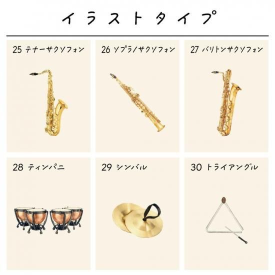 ヴァイオリン ヴィオラ チェロ コントラバス B♭トランペット Cトランペット ピッコロトランペット ポケットトランペット トロンボーン ホルン ユーフォニアム チューバ コルネット フリューゲルホルン フルート アルトフルート オーボエ イングリッシュホルン クラリネット アルトクラリネット バスクラリネット ファゴット コントラファゴット アルトサクソフォン テナーサクソフォン ソプラノサクソフォン バリトンサクソフォン ティンパニ シンバル トライアングル スネアドラム バスドラム ヴィブラフォン マリンバ ピアノ チェレスタ ハープ クラシックギター アコースティックギター エレキギター エレキベース ドラム